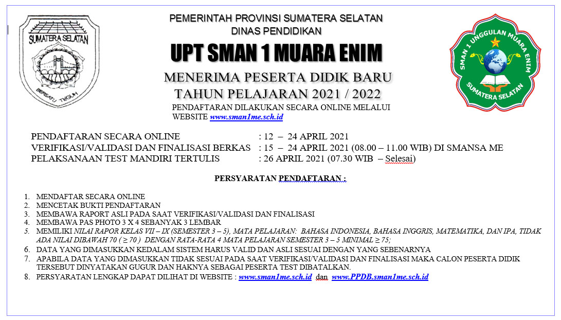 Penerimaan Peserta Didik Baru SMAN 1 Muara Enim Tahun Pelajaran 2022/2023